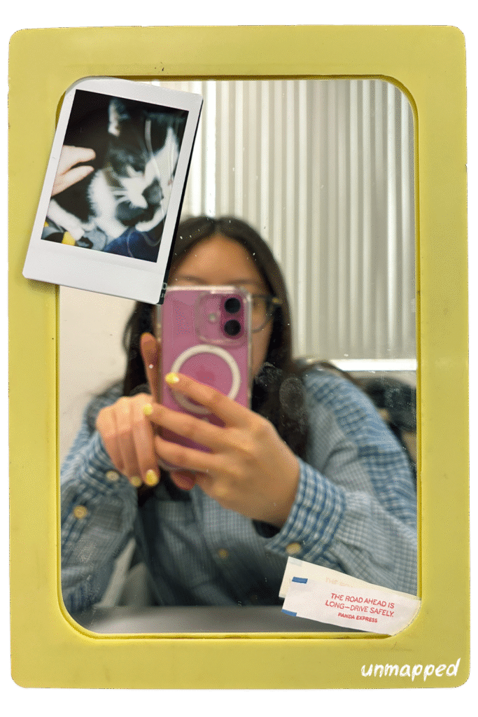 Here’s a mirror selfie from me at work with a mirror I stuck onto a cabinet (shelf?) at my desk. Honestly, I don’t think I can remove it. I used some really thick double sided nano tape and it’s ON THERE real good. I may not ever be allowed to leave this office now (BTW that is a pic of my boyfriend’s cat, Mojo. Isn’t she cute!?).